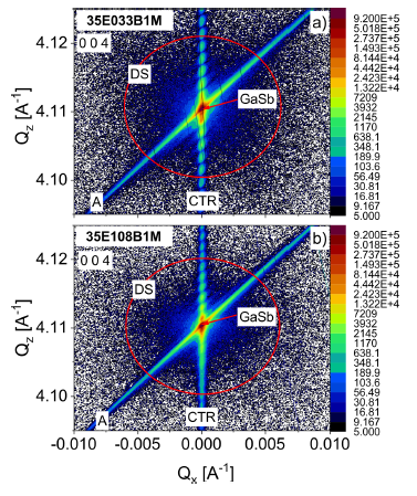 Based on the measurements of the 2𝜃–𝜔 curve, two samples were selected to perform reciprocal space mapping (RSM) measured around symmetric 004. Identical measurement settings were used for both structures: reciprocal lattice points data were collected around the substrate (GaSb) and the sattelite peak "0". Fig. 7(a)–(b) shows the RSM of two structures. For both, the lattice mismatch was impossible to determine, i.e., mismatch was below the resolution of the HRXRD device, which means that the structure of the growing SLs was perfectly matched. Therefore, only one maximum is observed on each of the reciprocal lattice maps. The recorded reciprocal lattice points of the GaSb substrate, as well as zero-order satellite peak exhibited narrowness in both Qx and Qz directions. They are both within the range of −0.00077Å−1 ≤ 𝑄𝑥 ≥ 0.00085Å−1 and −0.0019Å−1 ≤ 𝑄𝑧 ≥ 0.0023Å−1 for 35E033B1M structure; −0.00066Å−1 ≤ 𝑄𝑥 ≥ 0.00095Å−1 and −0.0026Å−1 ≤ 𝑄𝑧 ≥ 0.0019Å−1 for 35E108B1M. The RSM shows a streak perpendicular to the X-axis on the surface of the sample that corresponds to the crystal truncation rod (CTR) along with Pendelösung fringes that are also visible in both cases. Their appearance confirms that the produced structures are of good crystallographic quality. In particular, the streak coming from the analyser is visible (diagonal streak in Fig. 7). Furthermore, the measurements of RSMs, concentrated around reciprocal points of the lattice, unveiled the presence of diffuse scattering (DS). Although a minimal DS signal was noticed, it had no impact on the excellent crystal quality of this structure. The strain balanced studies based on the applied IFs confirmed the presented HRXRD measurements.