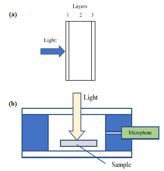 The samples were placed in a PA chamber. The PAsignal was recorded with a microphone. The experimental configuration applied is called total. A schematic diagram of the PA cell with the sample is presented in Fig. 1(b). In the experiment, the PA amplitude and phase spectra were measured in the photon energy range from 1.2 eV to 1.8 eV. The light modulation frequency was 128 Hz.