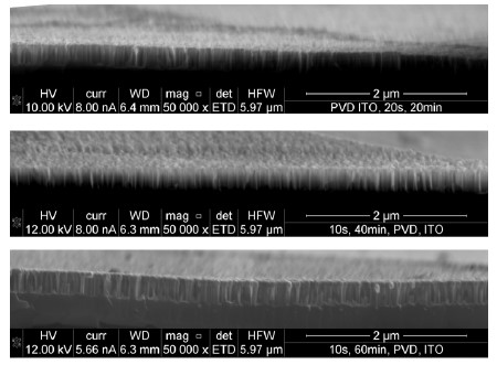 Examination of the silicon microstructure with wires and sputtered ITO layer showed that the applied layer completely covers the wires in the spaces between the wires, but forms the shape of a "match" which means that it is thicker in the upper part of the wire. This effect increases as the ITO layer thickens.